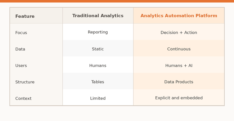 Unlike traditional data stacks that focus on pipelines and dashboards, an analytics automation platform focuses on: