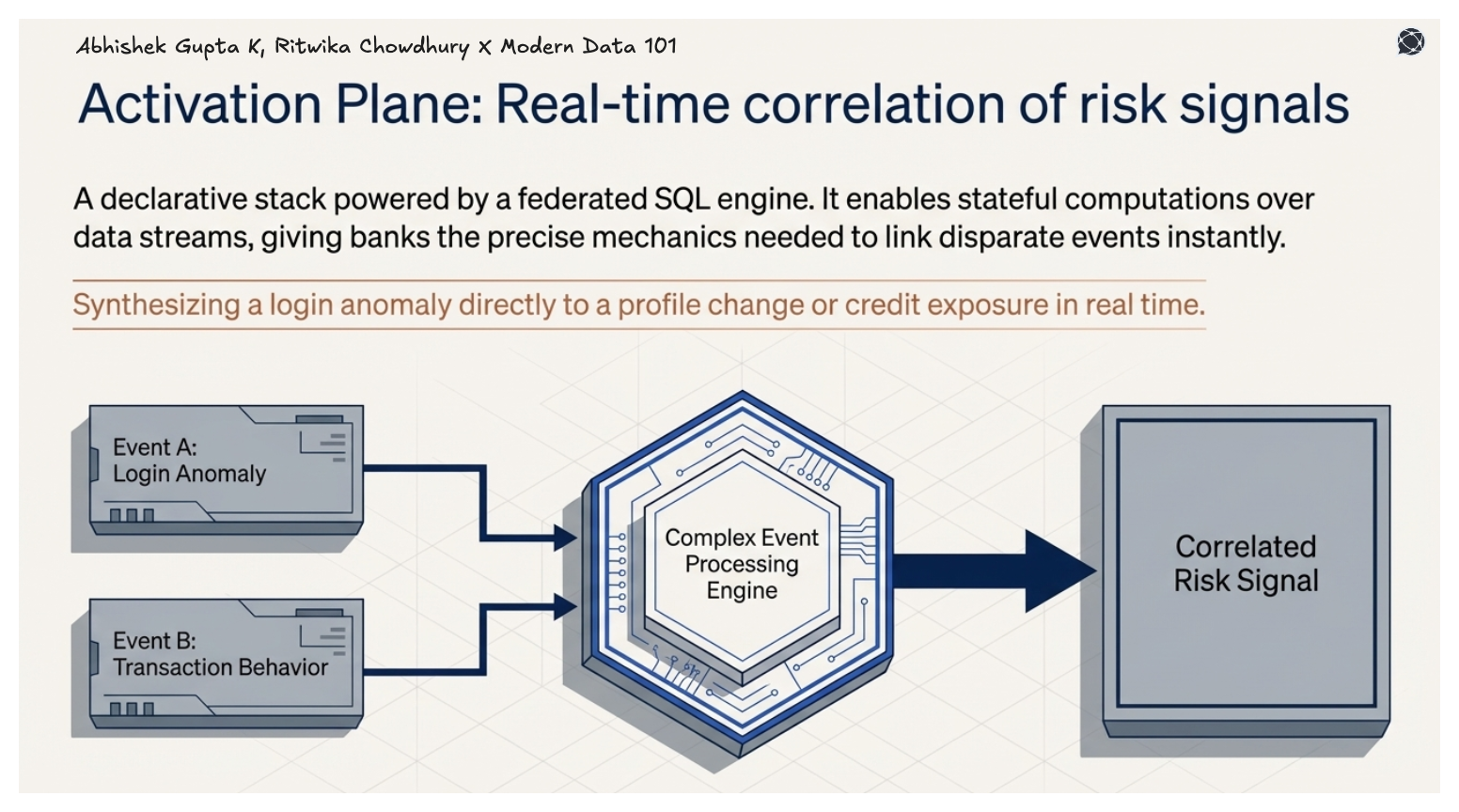 The Data Activation Plane provides a federated SQL query engine, a complex event processing engine for stateful computations over data streams, and a declarative stack to ingest, process, and syndicate data, precisely what banks need to correlate a login anomaly with transaction behaviour, or link a profile change to credit exposure, in real time.