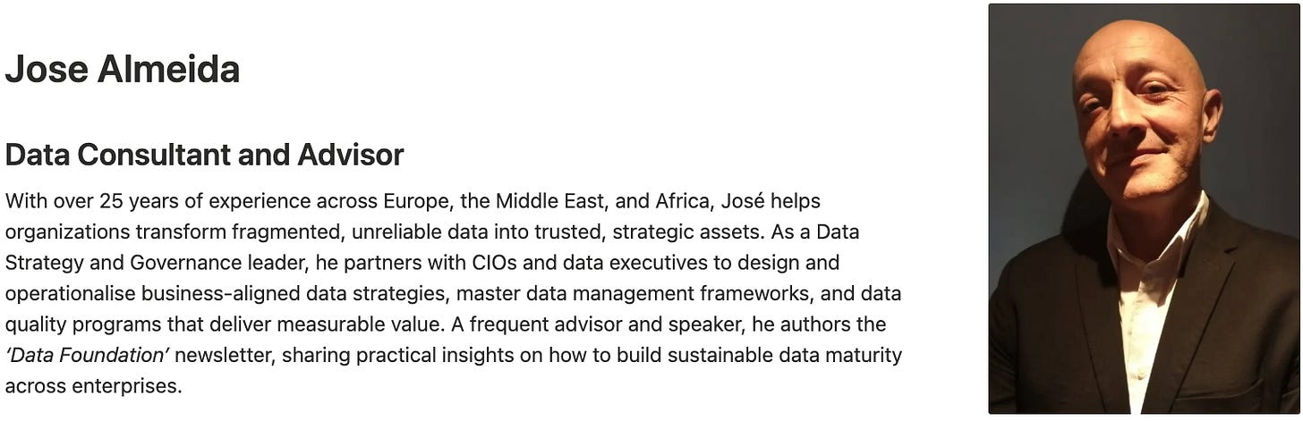 Jose Almeida is a Data Strategy & Governance Leader with 25+ years of experience driving business value across EMEA, and specialising in Master Data Management and Data Quality processes and technologies. Jose is also an Advisor, Speaker, and founder of the ‘Data Foundation’ Newsletter.