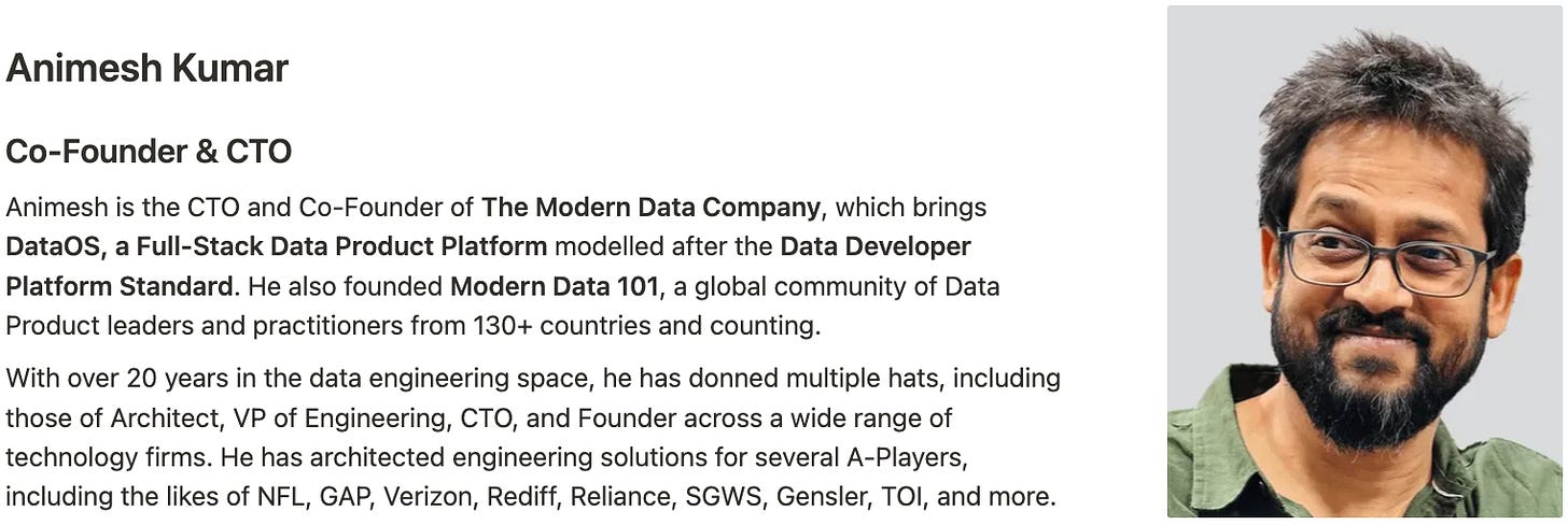 Animesh Kumar is the Co-Founder and Chief Technology Officer at The Modern Data Company, where he leads the design and development of DataOS, the company’s flagship data operating system. With over two decades in data engineering and platform development, he is also the founding curator of Modern Data 101, an independent community for data leaders and practitioners, and a contributor to the Data Developer Platform (DDP) specification, shaping how the industry approaches data products and platforms.
