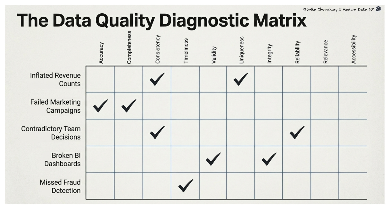 Accuracy measures how closely data reflects real-world entities or events. Inaccurate customer addresses, wrong product codes, or incorrect financial figures lead directly to failed campaigns, audit failures, and poor decisions.
