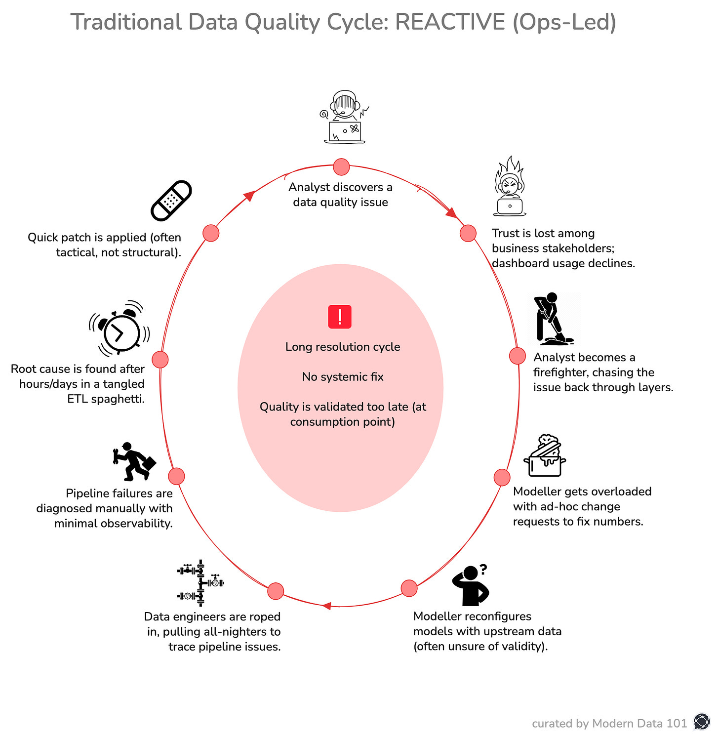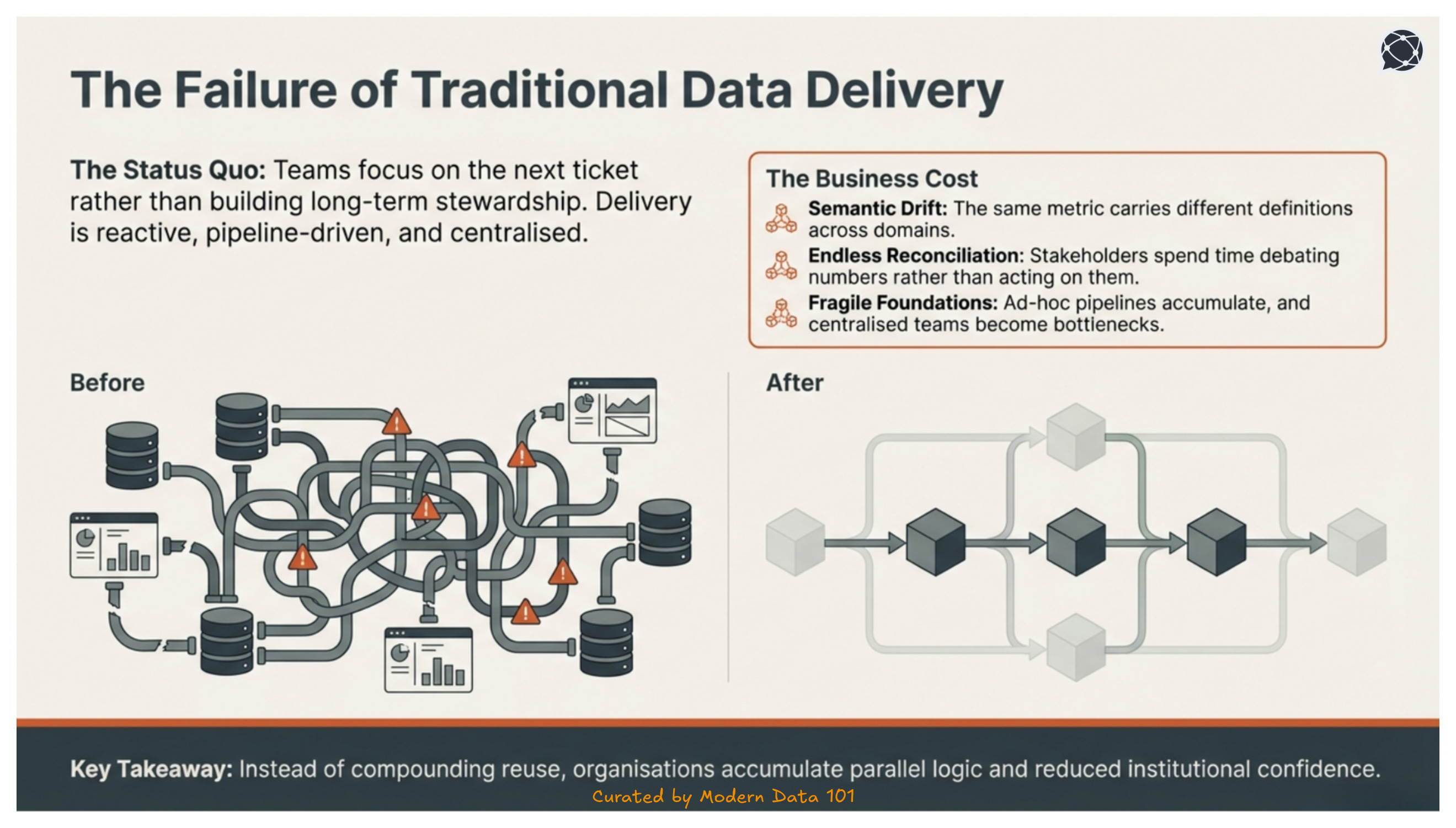 Teams are focused on moving on to the next ticket rather than building long-term usability. The traditional data delivery method revolves around being pipeline-driven, reactive, and centralised.