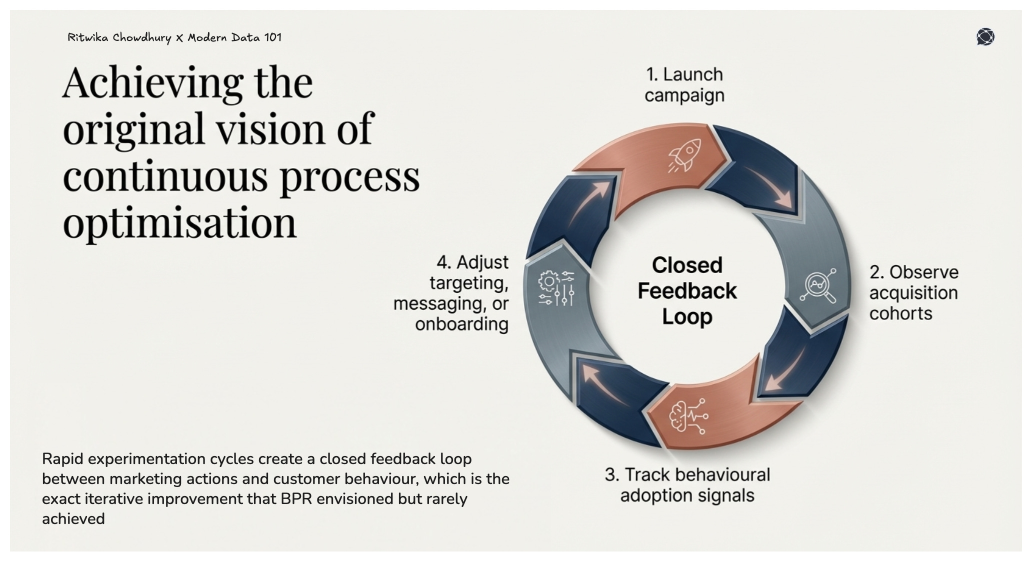 This creates a closed feedback loop between marketing actions and customer behaviour, exactly the type of iterative improvement that BPR originally envisioned but rarely achieved.
