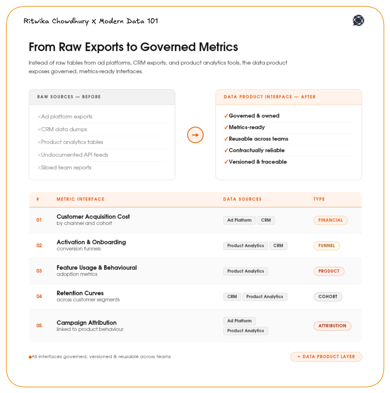 A data product resolves this by publishing metrics as contractual outputs. CAC, activation, retention, and feature adoption become trusted interfaces rather than disputed calculations. When marketing leaders can rely on the numbers, decision cycles accelerate.