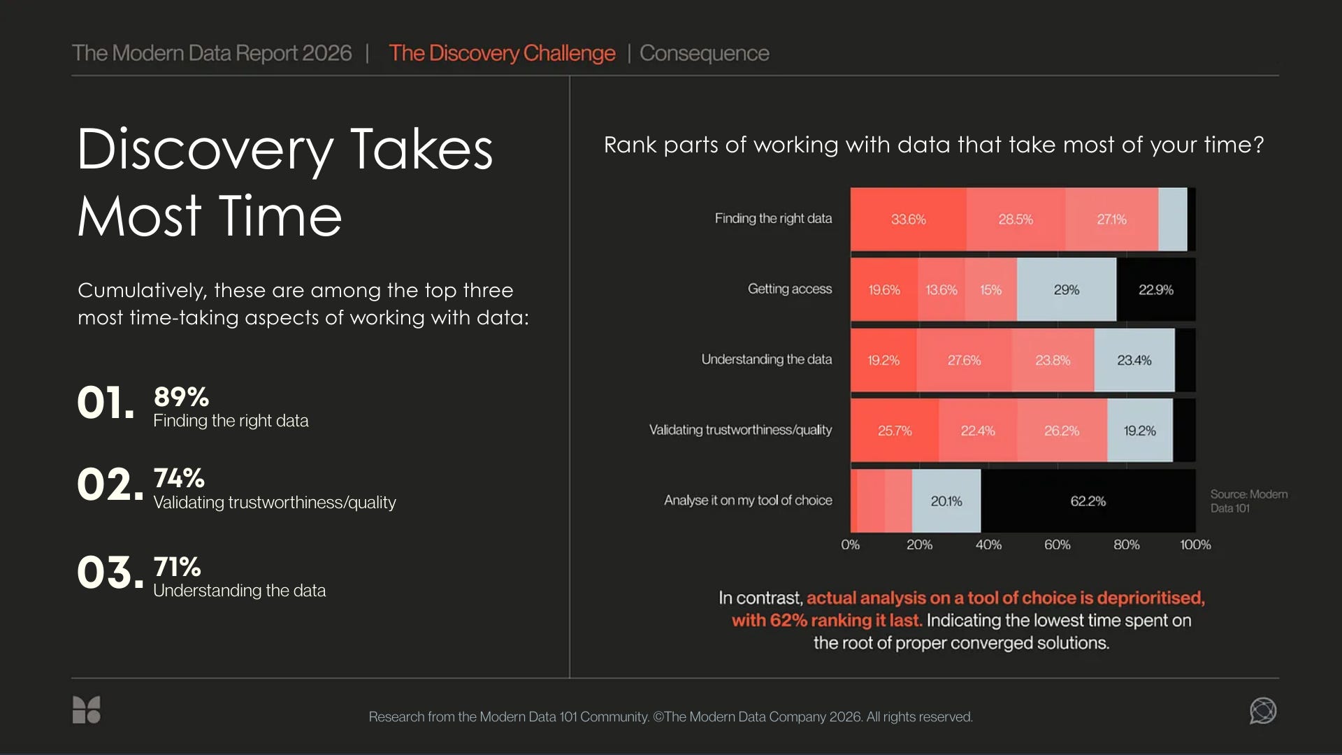 Most of the respondents suggest that discovery is where this gap first becomes visible. 89% of respondents say finding the right data is among their top three time drains.