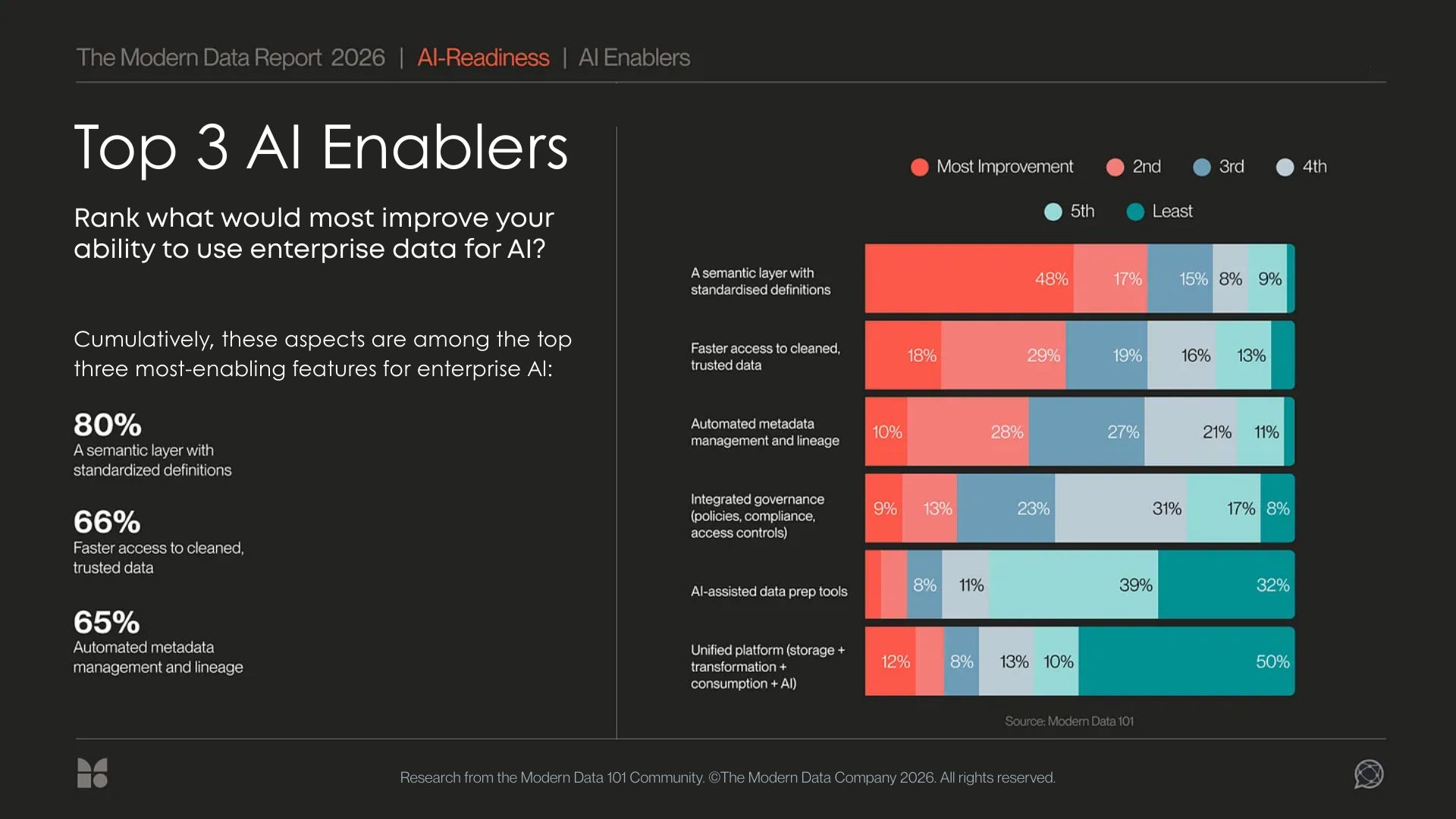 80% of respondents rank a semantic layer with standardized definitions as the most important enabler of AI: above AI tools themselves and above faster processing.