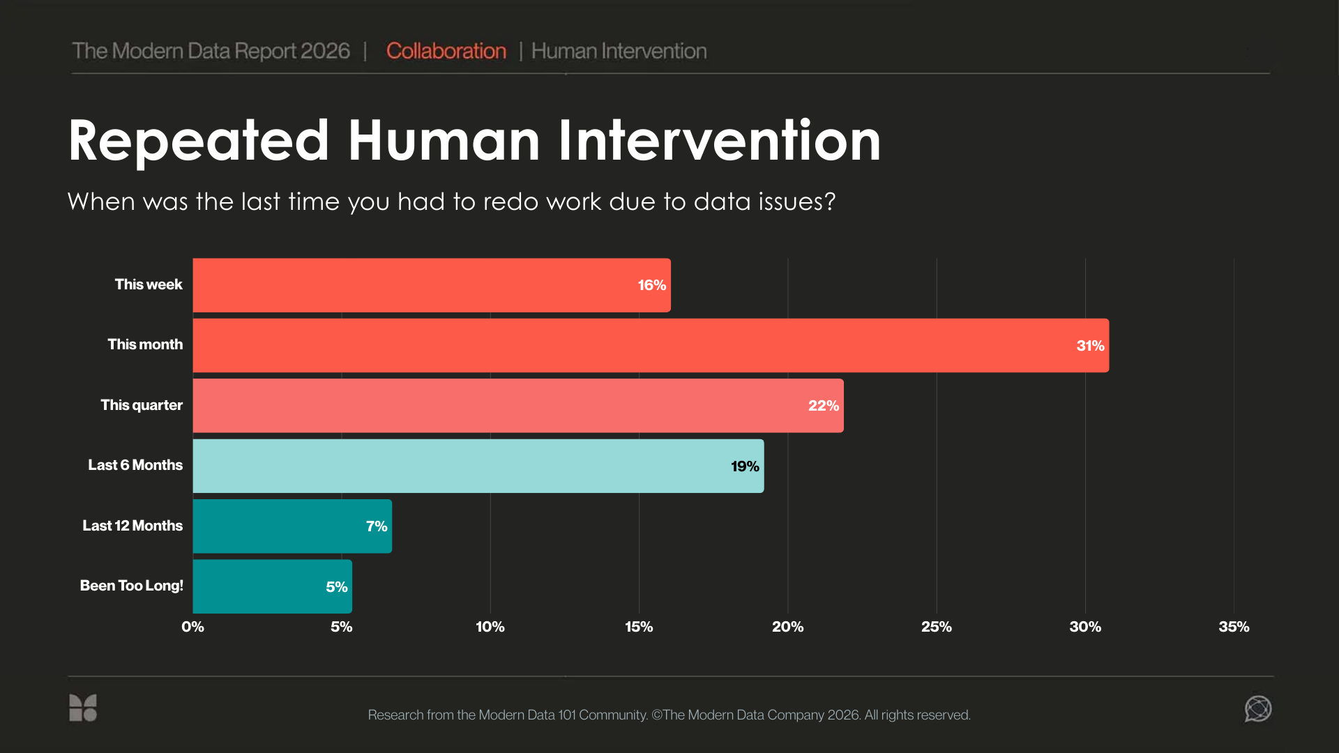 Through this survey, we are able to observe the precise reasons behind the current state of the data stack, and why so many data leaders, subject matter experts, and practitioners across industries report the same experience: despite years of investment in modern platforms, data still fails at the moment it is needed most.