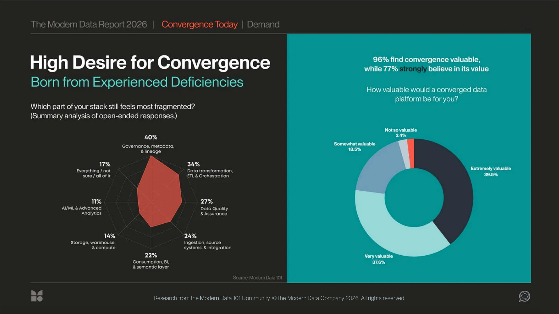 - Practitioners are aligned on the fix: convergence over complexity: unified access, embedded governance, shared semantics, and self-service are the foundations required to close the data activation gap.
