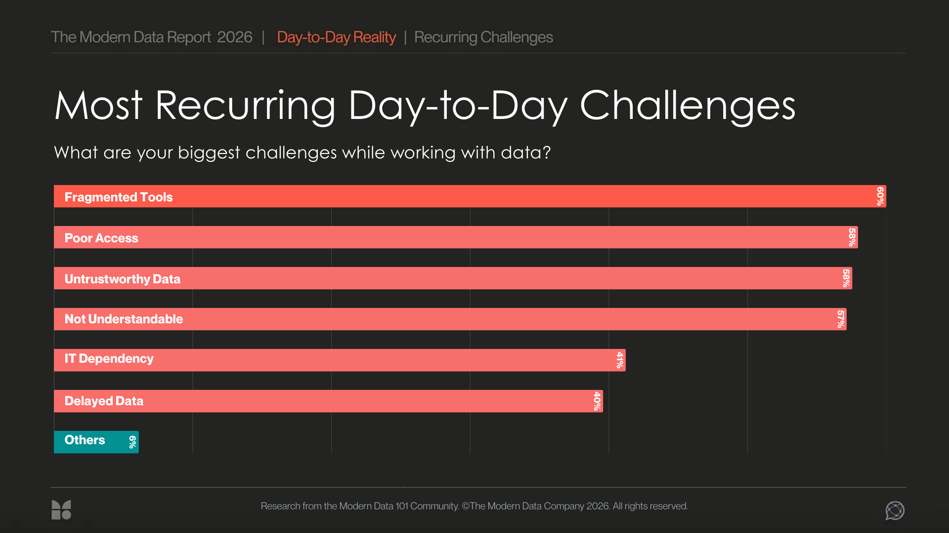 The Modern Data Report 2026 is a first-principles examination of why AI adoption stalls inside otherwise data-rich enterprises. Grounded in direct signals from practitioners and leaders, it exposes the structural gaps between data availability and decision activation.