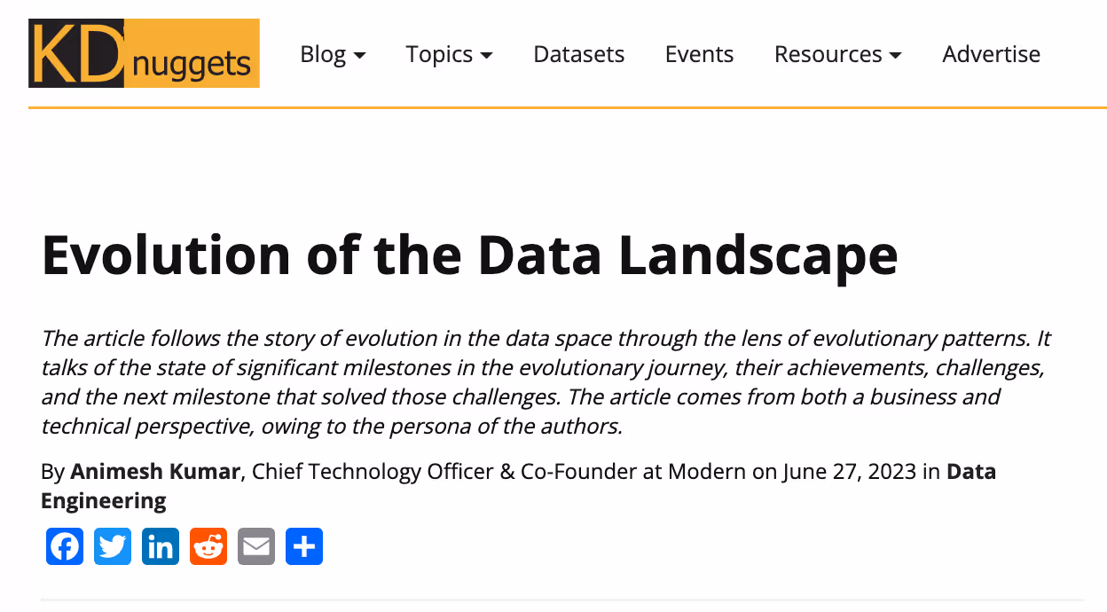 At Modern, Animesh directs the architecture and evolution of DataOS, a composable, scalable “data operating system” designed to break silos and accelerate high-impact data applications. He is also a founding contributor to the Data Developer Platform (DDP) specification, helping to define standards and patterns for how modern organisations build data-intensive systems. Animesh is also the founding author of Modern Data 101, a fast-growing knowledge hub and community of over 10,000 data leaders and practitioners. Through Modern Data 101, he shares insights, frameworks, and thought leadership on the evolving landscape of data products, decentralisation, and platform-driven strategies.